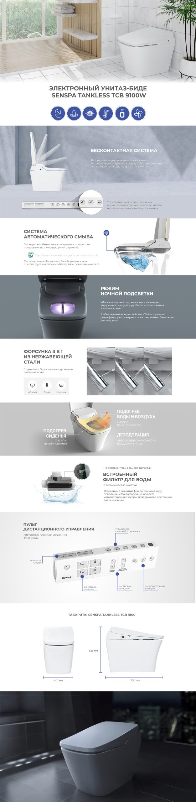 Электронный унитаз «SensPa Tankless TCB 9100W» – это новое слово в оснащении туалетной комнаты, это широкий выбор функций и элегантный европейский дизайн в одном устройстве. Нет больше тяжелых и неудобных модулей инсталляции, нет больше громоздких бачков и шума, не нужно покупать биде и искать для него место в ванной комнате! Передовые технологии, традиционно высокое Корейское качество и эргономичный дизайн позволяют одновременно решить вопросы гигиены, комфорта и экономии пространства, а стильный европейский внешний вид электронного унитаза «SensPa Tankless TCB 9100W» станет украшением интерьера современной ванной комнаты.
